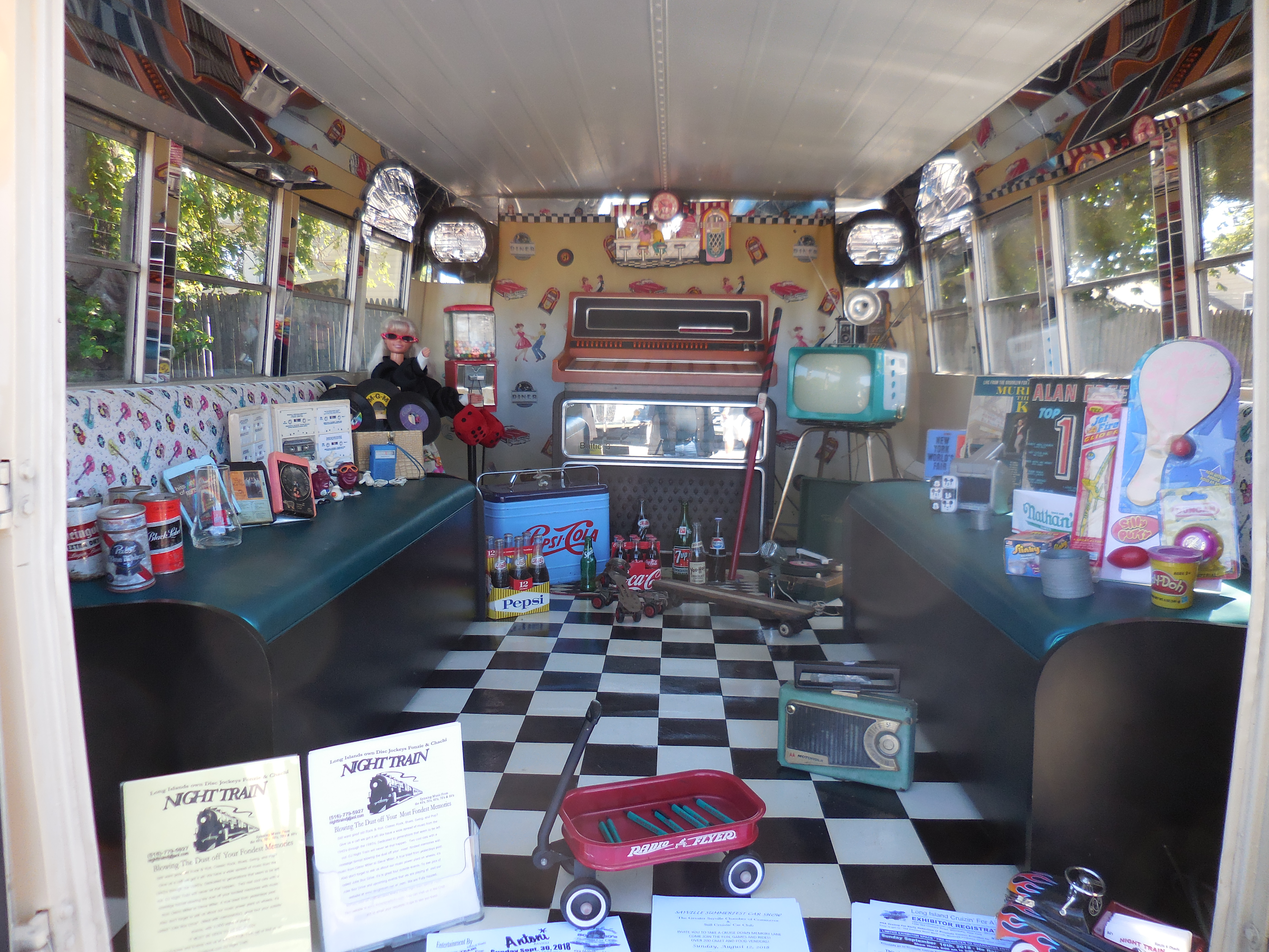 The inside is loaded with memorabilia which I’m sure will knock the dust off some of you fondest memories, from the Wurlitzer Jukebox playing 45’s or watching some of your favorite black and white TV shows like American Bandstand playing of a 1956 GE television, or maybe it’s the roller-skates, 9 volt transistor radio, or the 8 track tapes you will fondly remember.